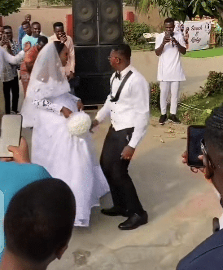 His bride stared at him in awe as he began dancing awkwardly in the presence of guests who watched him with wide grins on their faces.