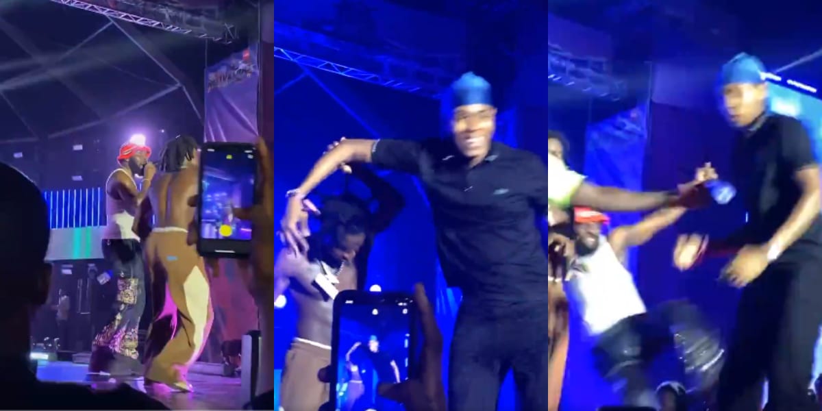 The singer and the rapper were entertaining their fans when one overzealous fan mounted the stage to hold Shallipopi