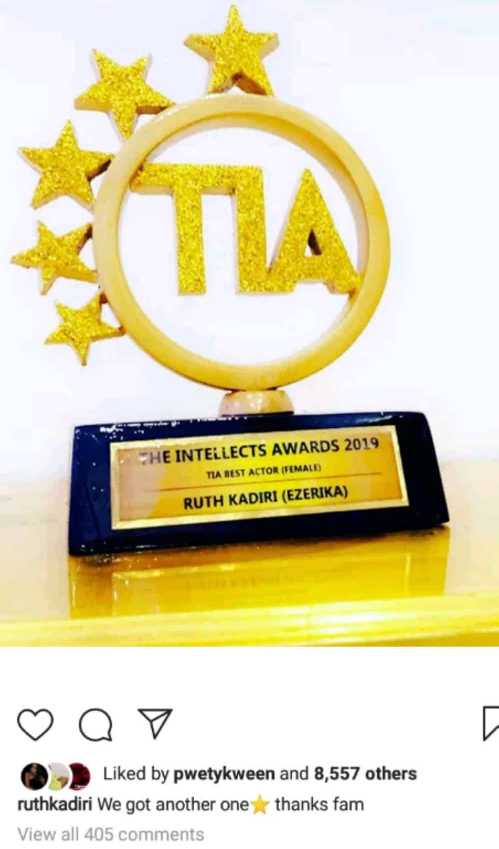 Nollywod actress, screenwriter and film producer Ruth Kadiri, has bagged the 2019 best actor(Female award) courtesy of ‘The Intellect Awards.