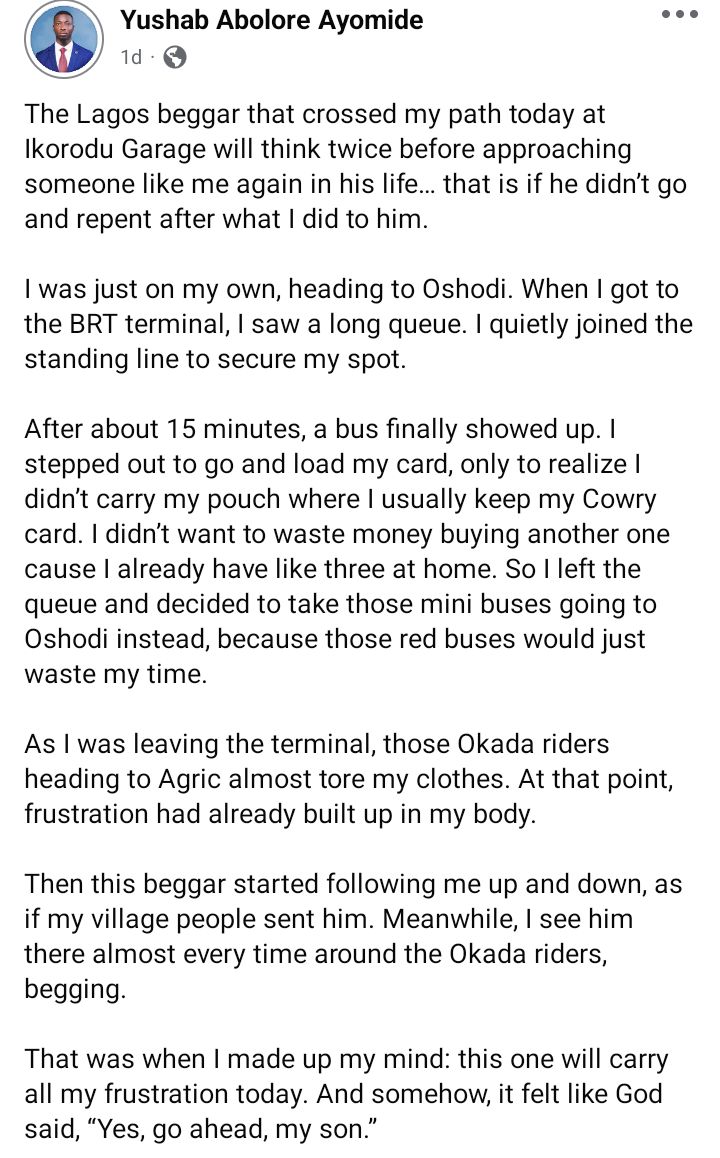 A man, Yushab Abolore Ayomide, has shared a dramatic encounter with a beggar at Ikorodu Garage, describing how he turned a routine commute into a lesson that left the man shaken and reportedly reconsidering his approach to begging.