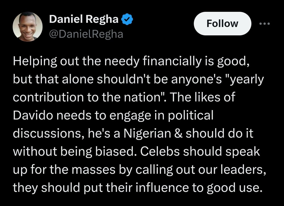 Online personality, Daniel Regha, has ‘flawed’ Nigerian singer, Davido, in response to the ‘300 million Naira’ donation by the singer to orphanage homes in the country.