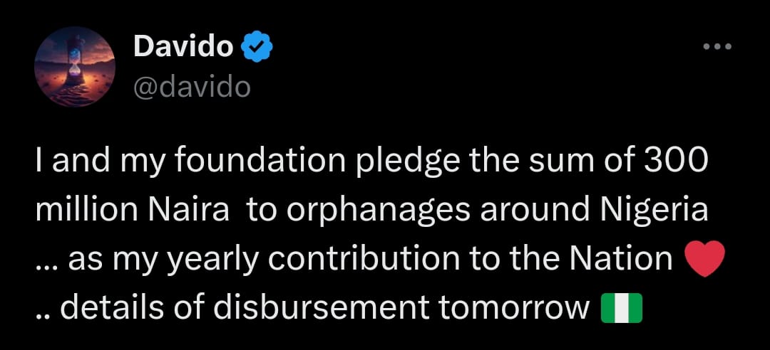 The Nigerian singer, Davido, earlier in the day, announced the sum of ‘300 million Naira’ from his foundation to orphanage homes in the country.