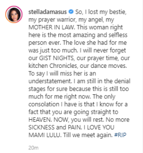 “So, I lost my bestie, my prayer warrior, my angel, my MOTHER IN LAW. This woman right here is the most amazing and selfless person ever. The love she had for me was just too much. I will never forget our GIST NIGHTS, our prayer time, our kitchen Chronicles, our dance moves. To say I will miss her is an understatement.