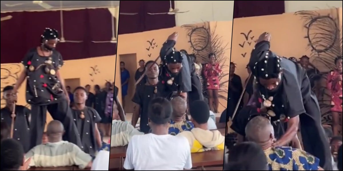 A video circulating online shows a lecturer’s reaction as a theatre arts student grabs him by the neck during a drama presentation in class.