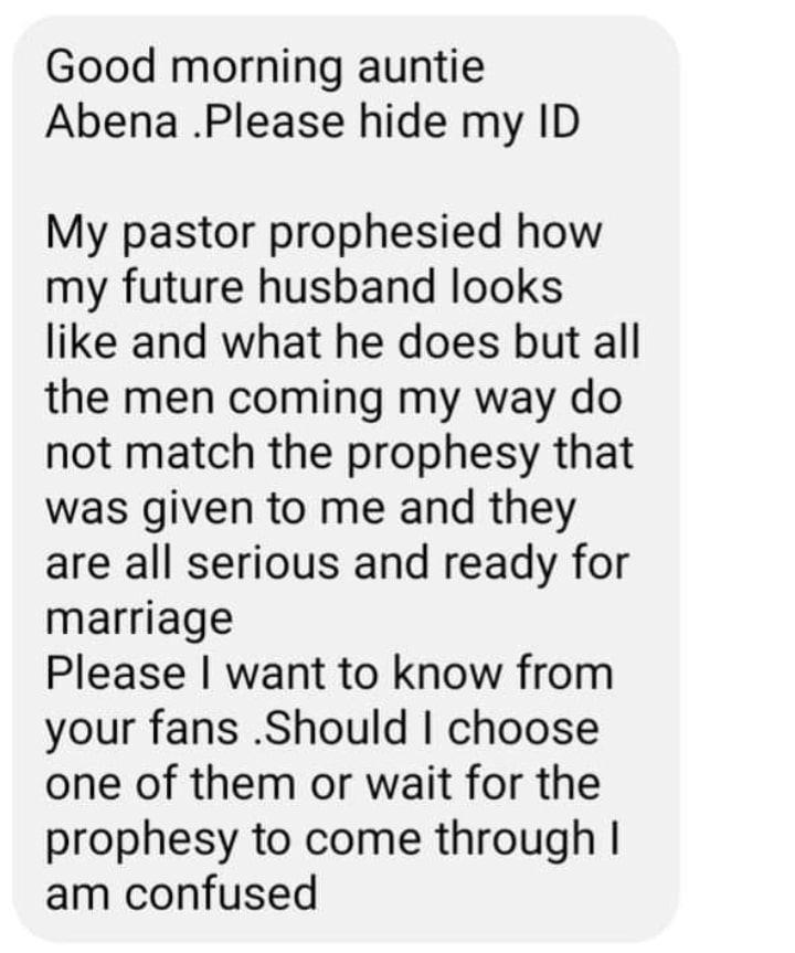 “My pastor prophesied how my future husband looks like and what he does but all the men coming my way do not match the prophesy that was given to me and they are all serious and ready for marriage
