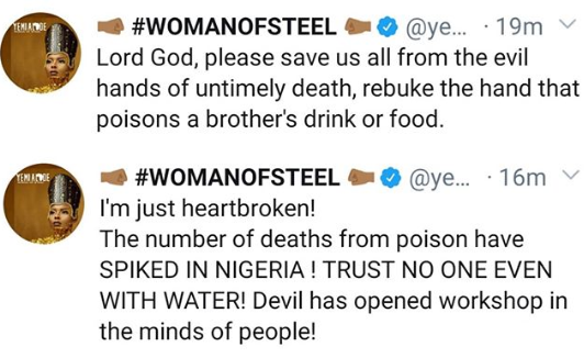 I’m just heartbroken! The number of deaths from poison have SPIKED IN NIGERIA ! TRUST NO ONE EVEN WITH WATER! Devil has opened workshop in the minds of people!” she tweeted
