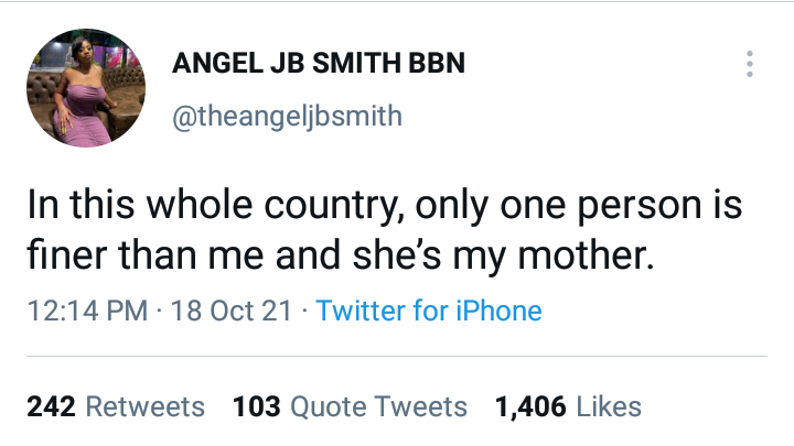 Reality TV star, Angel has revealed that out of the millions of beautiful people in the whole of Nigeria, only her mother is finer than her.