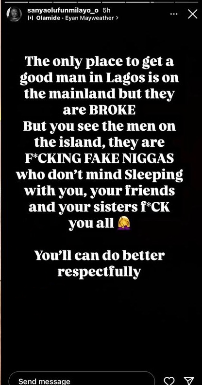 She wrote; “The only place to get a good man in Lagos is on the mainland but they are BROKE