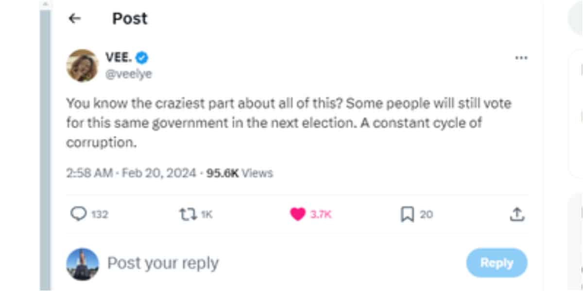 She wrote; “You know the craziest part about all of this? Some people will still vote for this same government in the next election. A constant cycle of corruption.”
