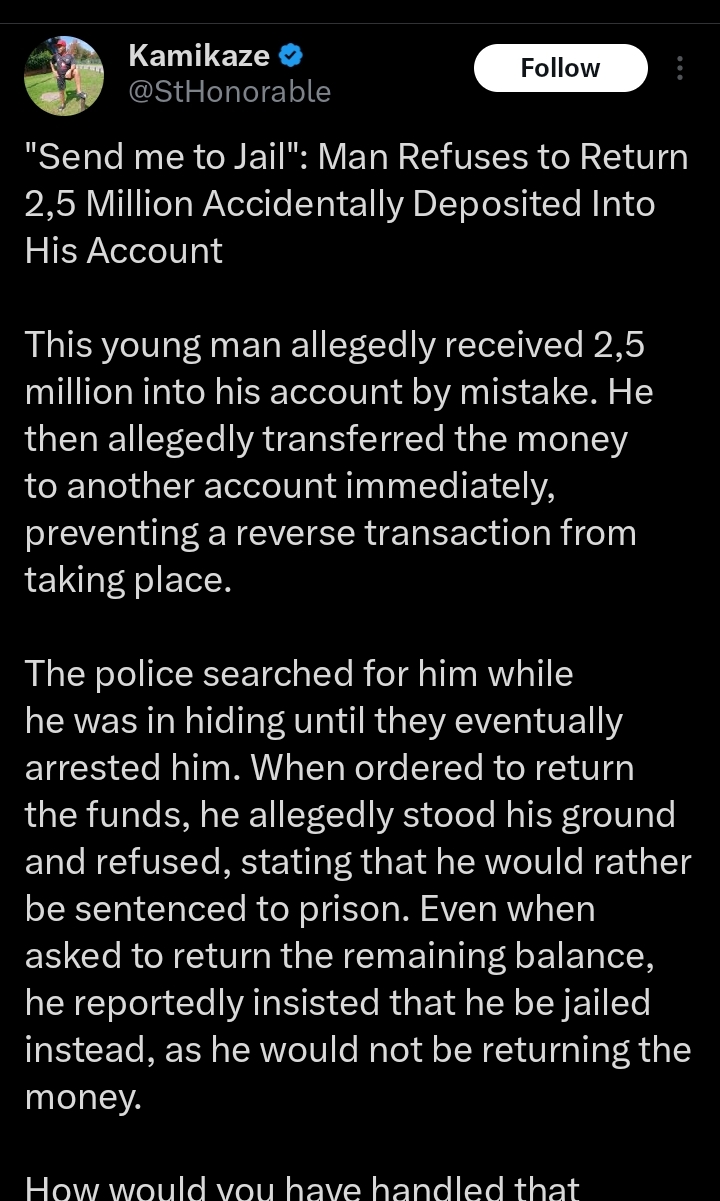 A man has gone viral after reportedly choosing jail term over returning ₦2.5 million mistakenly deposited into his account.