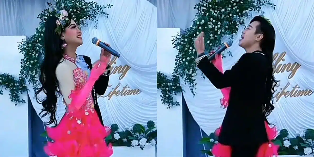 A woman has shocked many internet users as she puts on a male and female clothing to perform a song at an event.