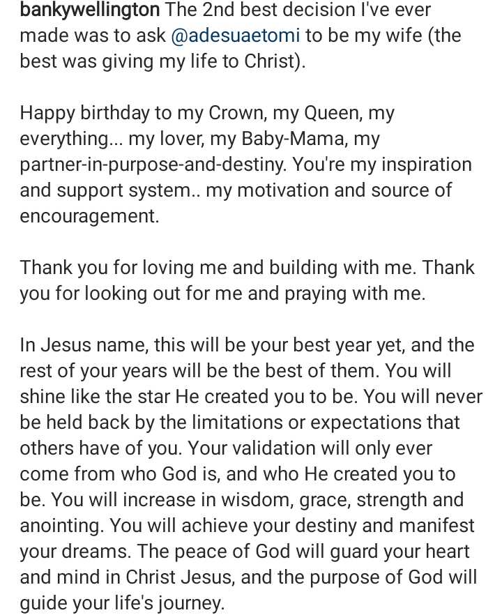 “The 2nd best decision I’ve ever made was to ask @adesuaetomi to be my wife (the best was giving my life to Christ).