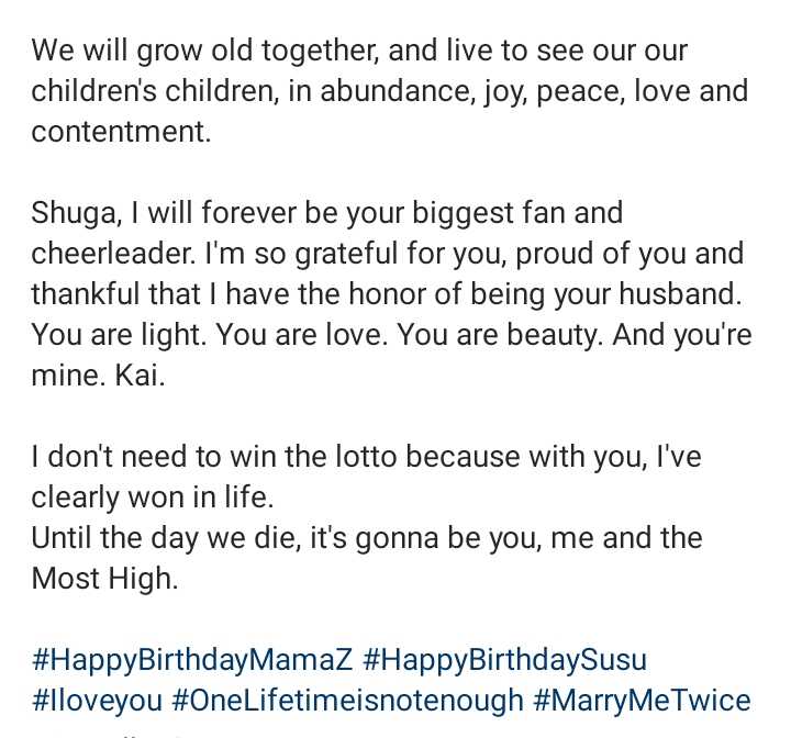 Shuga, | will forever be your biggest fan and cheerleader. I’m so grateful for you, proud of you and thankful that | have the honor of being your husband. You are light. You are love. You are beauty. And you’re mine. Kai.