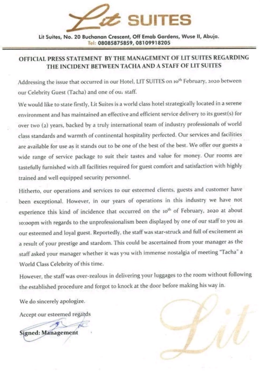 The management of Lit Suites hotel has released an official statement in reaction to the incident that occurred in Tacha‘s room on Monday.