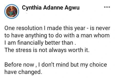 A Nigerian entrepreneur has gone online to divulge her resolution of never dating a man who makes less money than her.
