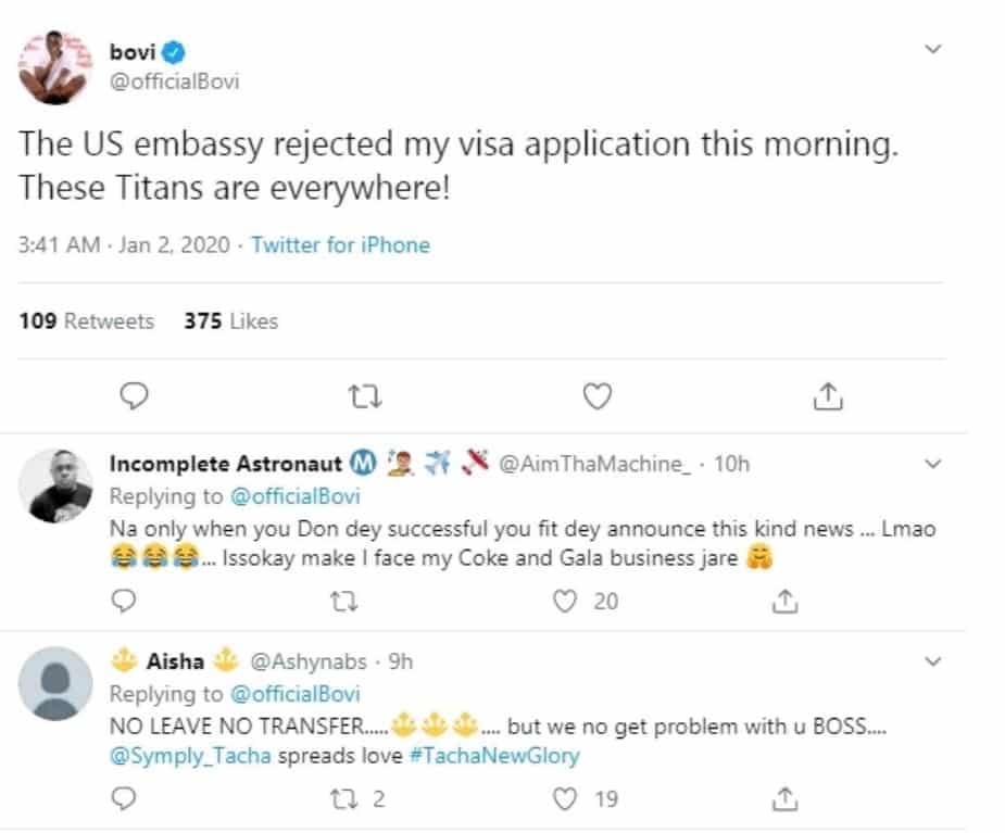 “The US embassy rejected my visa application. These Titans are everywhere”- Comedian Bovi
