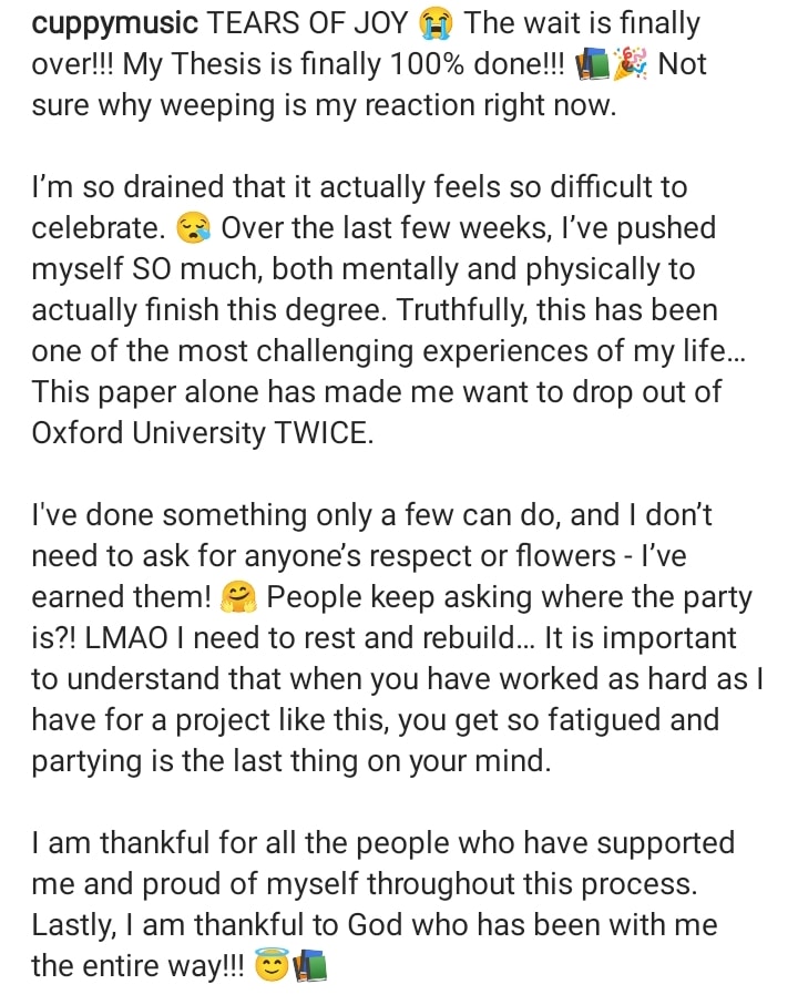 “The wait is over” – Cuppy weeps tears of joy, pens emotional note as she completes her thesis
