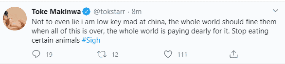 “Not to even lieIi am low key mad at china, the whole world should fine them when all of this is over, the whole world is paying dearly for it. Stop eating certain animals #Sigh.”