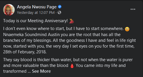 In a post she shared on her Facebook page, Angela revealed that she met her husband on the 28th day of February, 2018 and has chosen to celebrate him with lovely words.