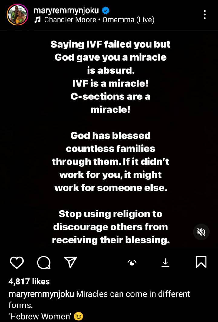 Nollywood actress Mary Njoku has taken to social media to educate Nigerian religious women about IVF, emphasizing that there is nothing wrong with the fertility treatment.