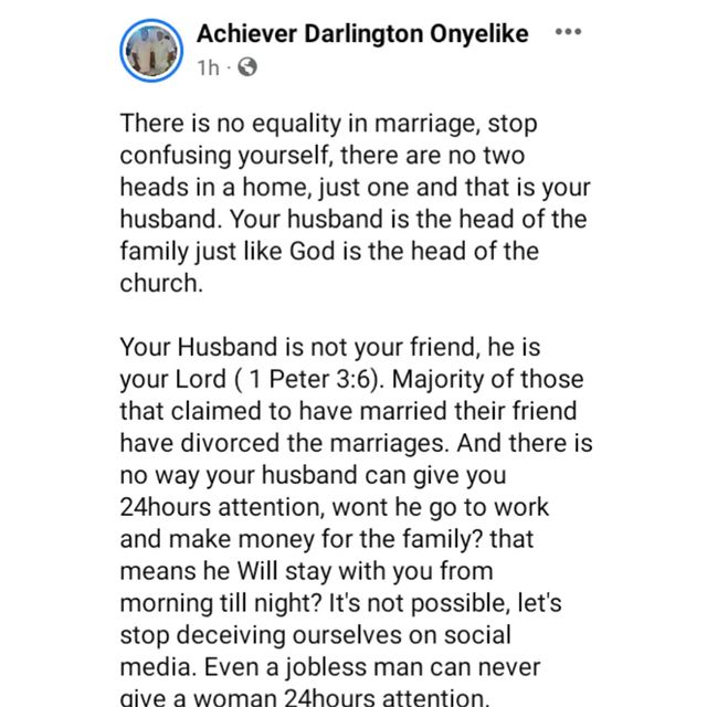 The man identified on Facebook as Achiever Darlington Onyelike took to the platform to say that there cannot be two heads in a home.