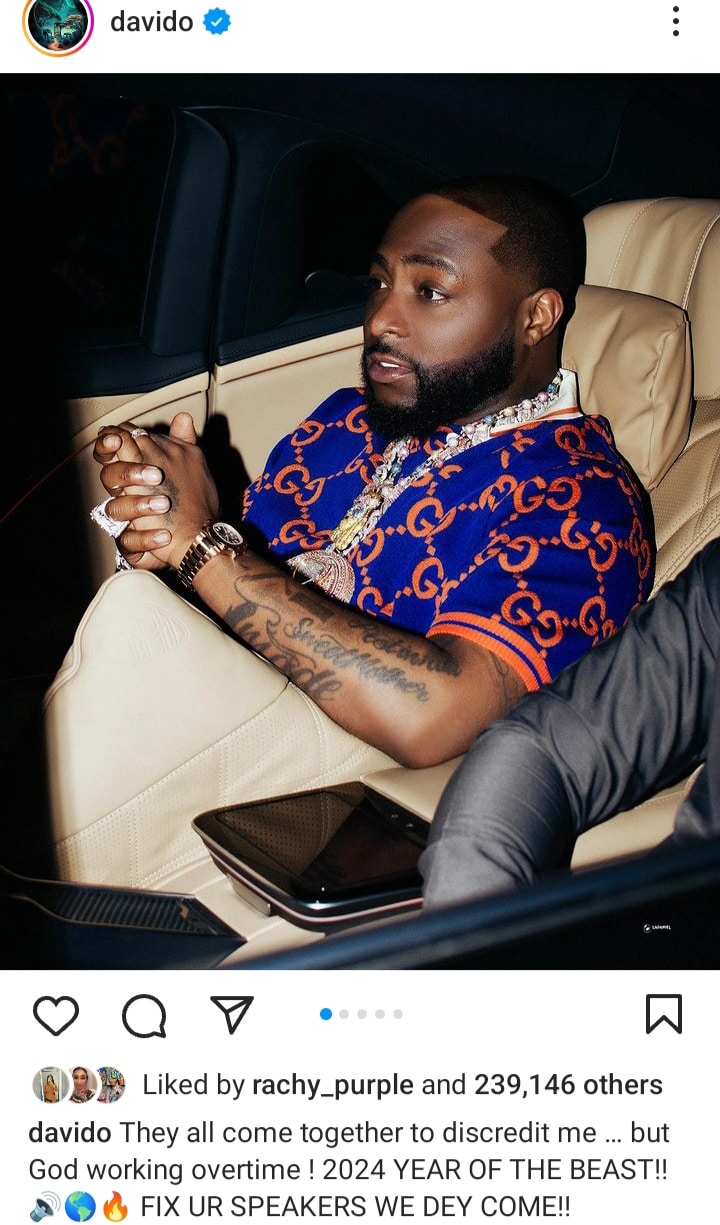 “They all come together to discredit me … but God working overtime ! 2024 YEAR OF THE BEAST!! FIX UR SPEAKERS WE DEY COME!!”