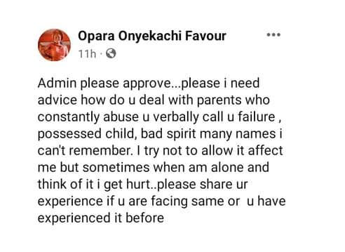 A Nigerian lady identified as Opara Onyekachi Favour has cried out on Facebook over her sad experience with verbally abusive parents.