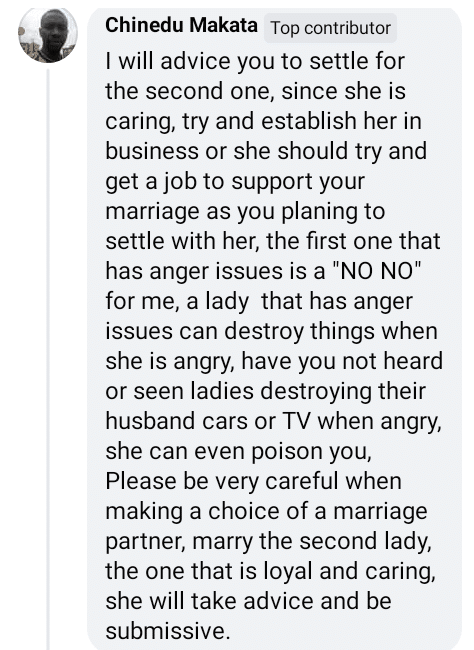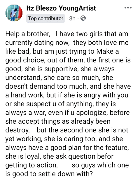 “Help a brother, I have two girls that I am currently dating now. They both love me like bad, but am just trying to make a good choice, out of them, the first one is good, she is supportive, she always understand, she care so much, she doesn’t demand too much, and she have a hand work, but if she is angry with you or she suspect u of anything, they is always a war, even if u apologize, before she accept things as already been destroy.