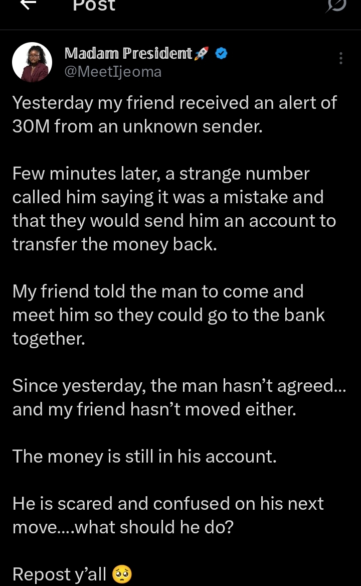 ”My friend told the man to come and meet him so they could go to the bank together.Since yesterday, the man hasn’t agreed and my friend hasn’t moved either.The money is still in his account.He is scared and confused on his next move”, The tweet reads.
