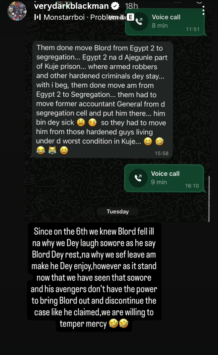 It would be recalled that Blord was arrested and remanded in Kuje Prison on April 1, 2026, over allegations of impersonating social media personality VeryDarkMan.