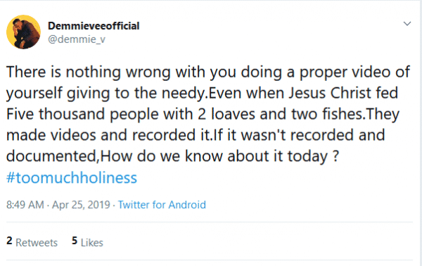 “There is nothing wrong with you doing a proper video of yourself giving to the needy.Even when Jesus Christ fed Five thousand people with 2 loaves and two fishes.They made videos and recorded it.If it wasn’t recorded and documented,How do we know about it today?”