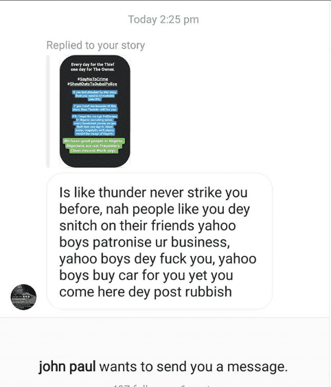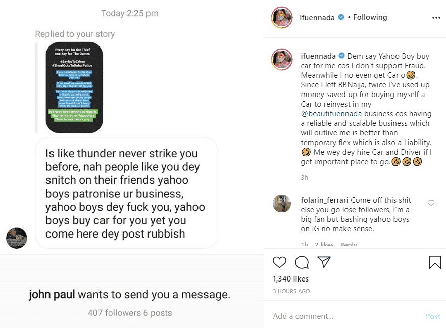 However, the post didn’t go down well for supporters of yahoo boys who began to send her demeaning messages. Some even went as far as calling her a prostitute.