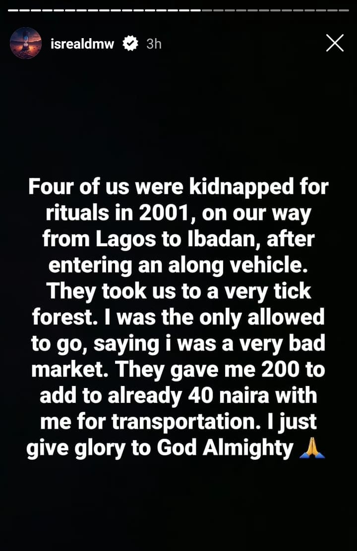 “Four of us were kidnapped for rituals in 2001, on our way from Lagos to Ibadan, after entering an along vehicle. They took us to a very tick forest. I was the only allowed to go, saying i was a very bad market. They gave me 200 to add to already 40 naira with me for transportation. I just give glory to God Almighty”