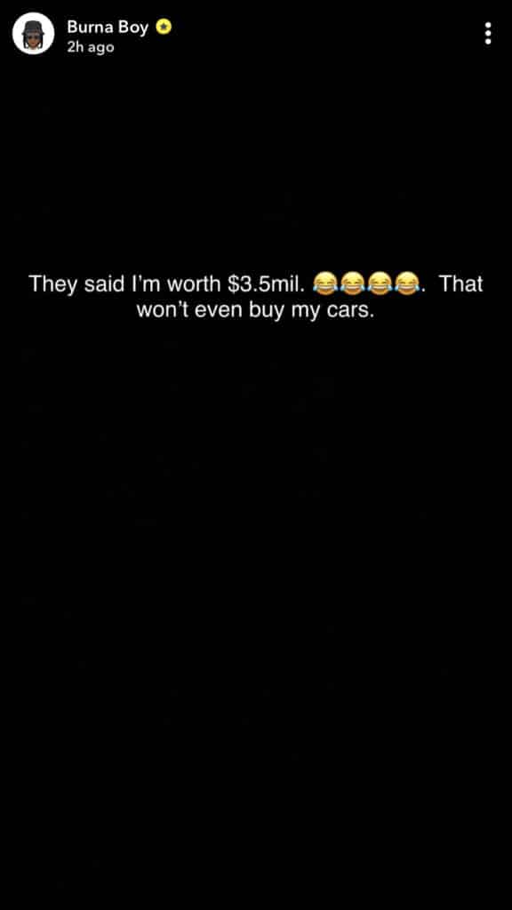 According to Forbes, the 29-year-old Rivers born Afrobeats singer is worth $3.5 million. He has now taken to Snapchat to react saying that $3.5 million won’t even buy his cars.