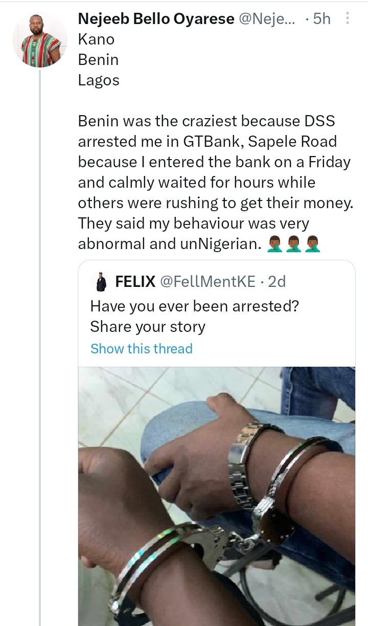 “Benin was the craziest because DSS arrested me in GTBank, Sapele Road because I entered the bank on a Friday and calmly waited for hours while others were rushing to get their money. They said my behaviour was very abnormal and unNigerian. 🤦🏾♂️🤦🏾♂️🤦🏾♂️