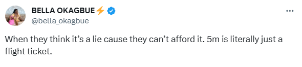“When they think it’s a lie cause they can’t afford it. 5m is literally just a flight ticket,” Bella wrote.