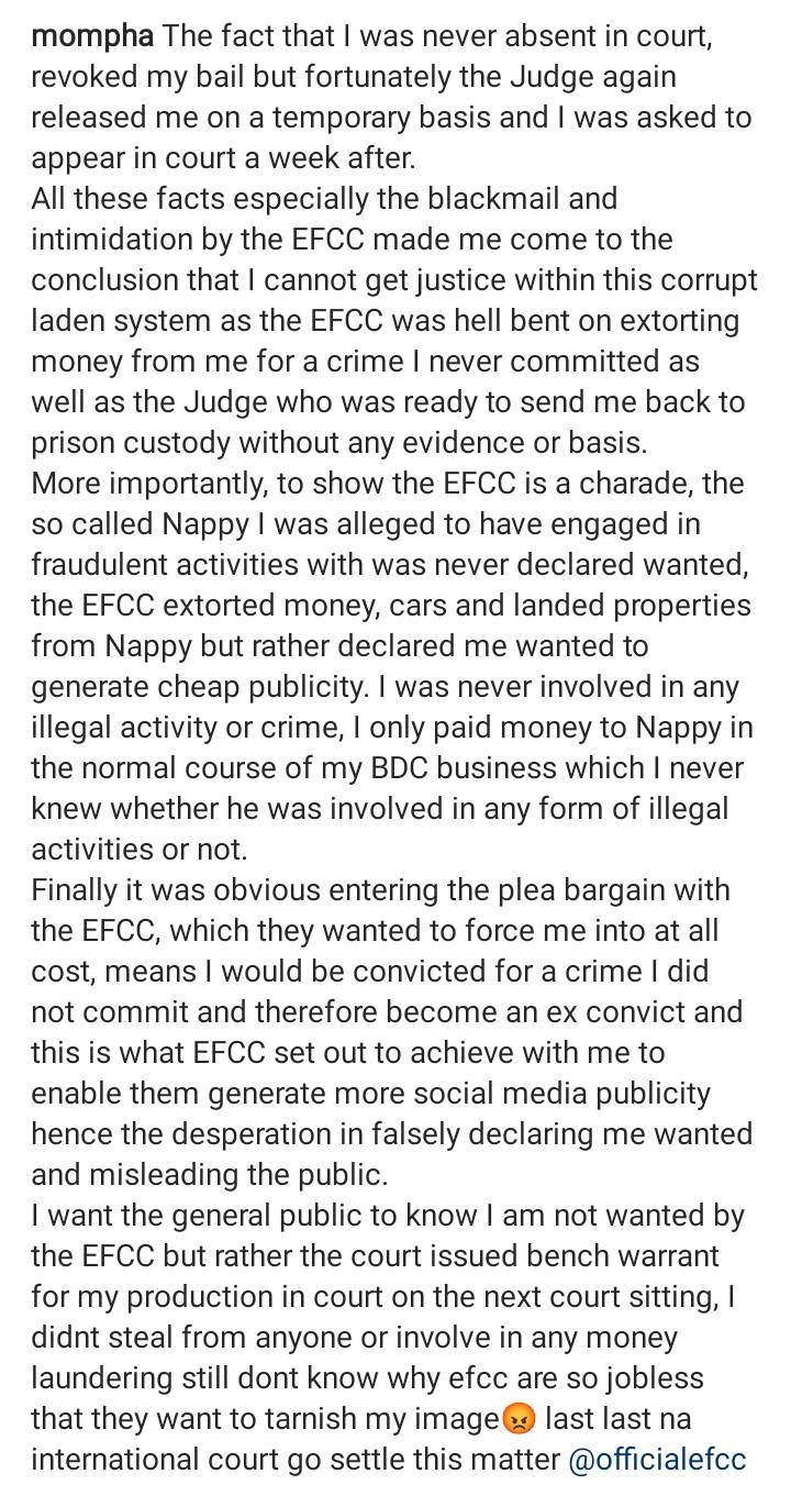 According to Mompha, EFCC had already extorted money, cars and landed property from Nappy but declared him, Mompha, wanted to get ‘cheap publicity’.