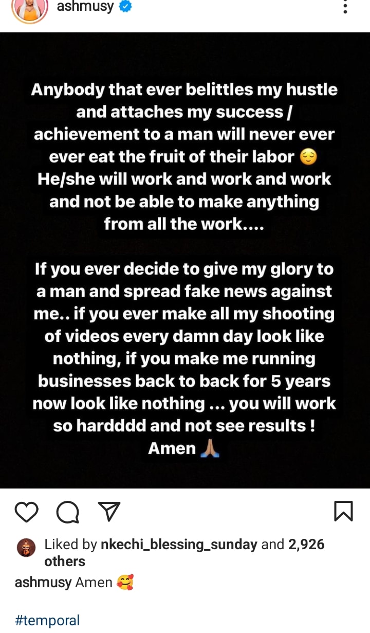 “They will never eat the fruit of their labour” – Ashmusy rains curses on those belittling, attaching her achievements to men