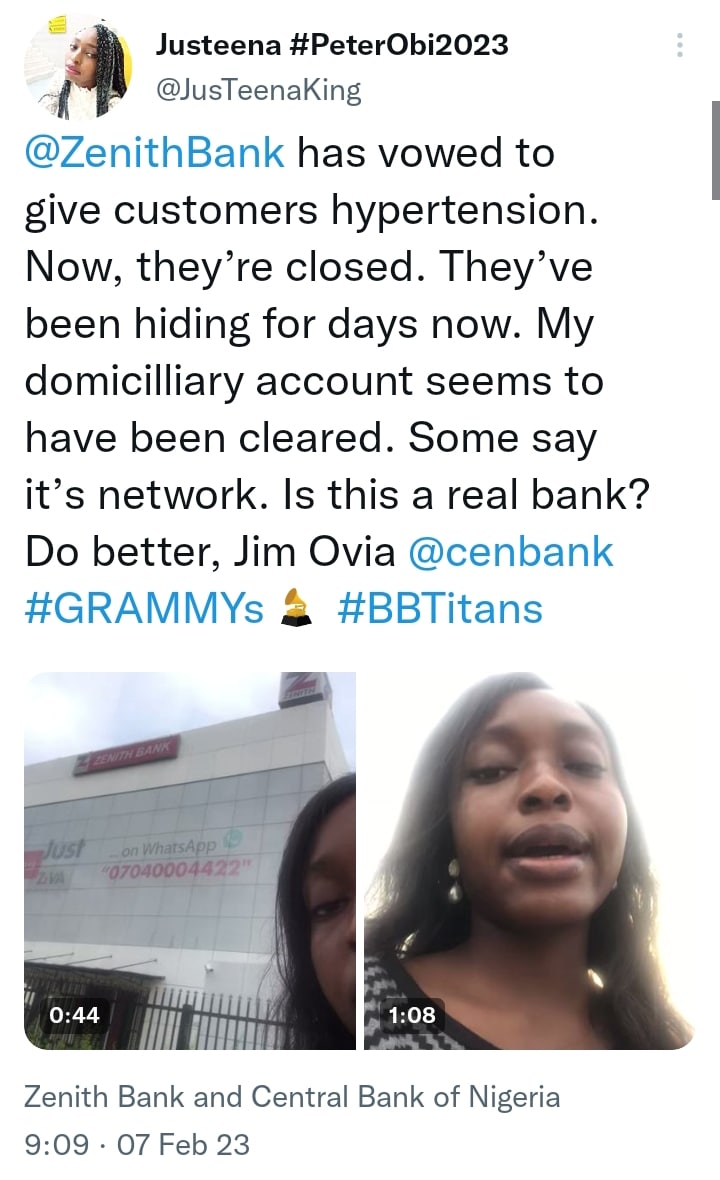@ZenithBank has vowed to give customers hypertension. Now, they’re closed. They’ve been hiding for days now. My domicilliary account seems to have been cleared. Some say it’s network. Is this a real bank? Do better, Jim Ovia @cenbank #GRAMMYs #BBTitans pic.twitter.com/v9mSRgRVKe
