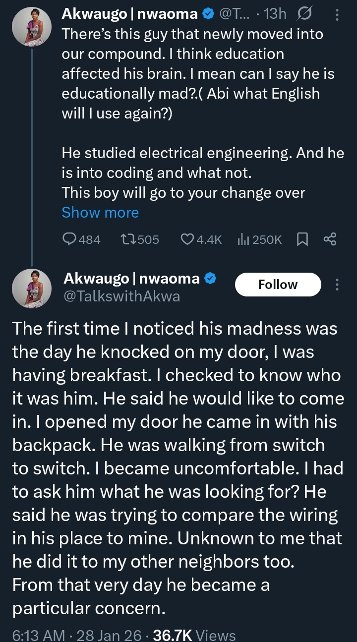 In a lengthy post, the woman described how a man who recently moved into her compound allegedly began interfering with the building’s electrical systems, leaving residents alarmed and frustrated.