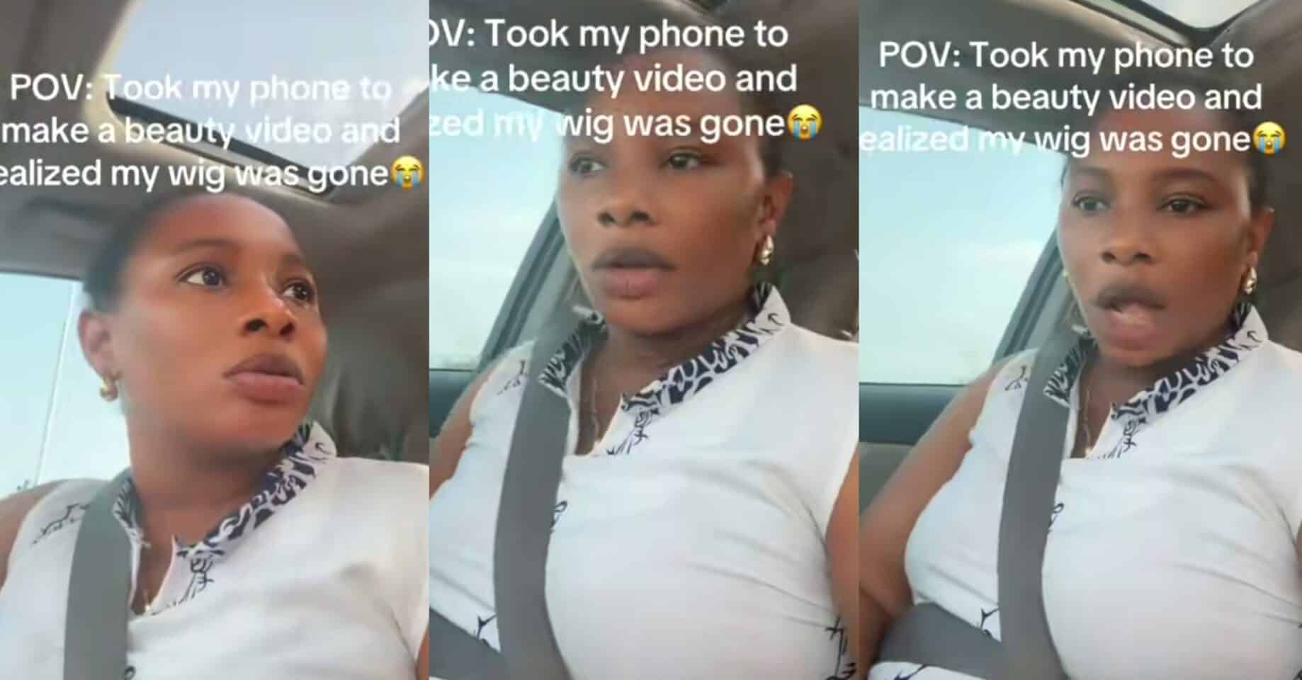 “This is a sign”- Lady in tears as wig goes missing on her head without noticing