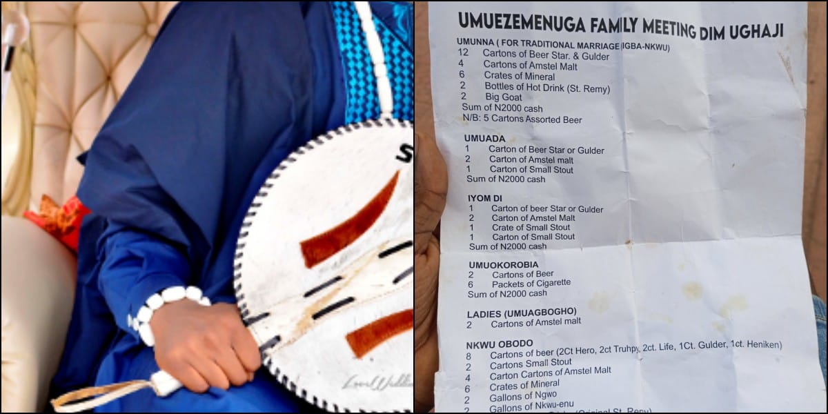 The man identified as @Kene_Nnewi took to the platform to reveal that his bride-to-be’s family handed him a marriage list whose items contained many outrageous things.