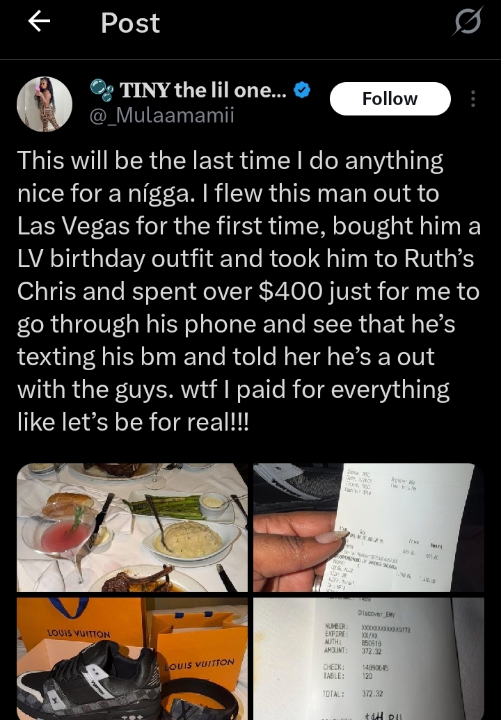 ”This will be the last time I do anything nice for a nígga. I flew this man out to Las Vegas for the first time, bought him a LV birthday outfit and took him to Ruth’s Chris and spent over $400 just for me to go through his phone and see that he’s texting his bm and told her he’s a out with the guys. wtf I paid for everything like let’s be for real“, Her tweet reads.