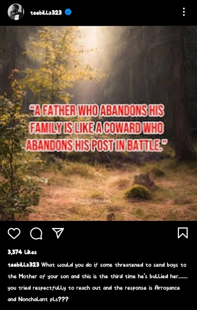 In a recent post, Teebillz posted a message on Instagram, stating that a father who abandons his family is a coward.