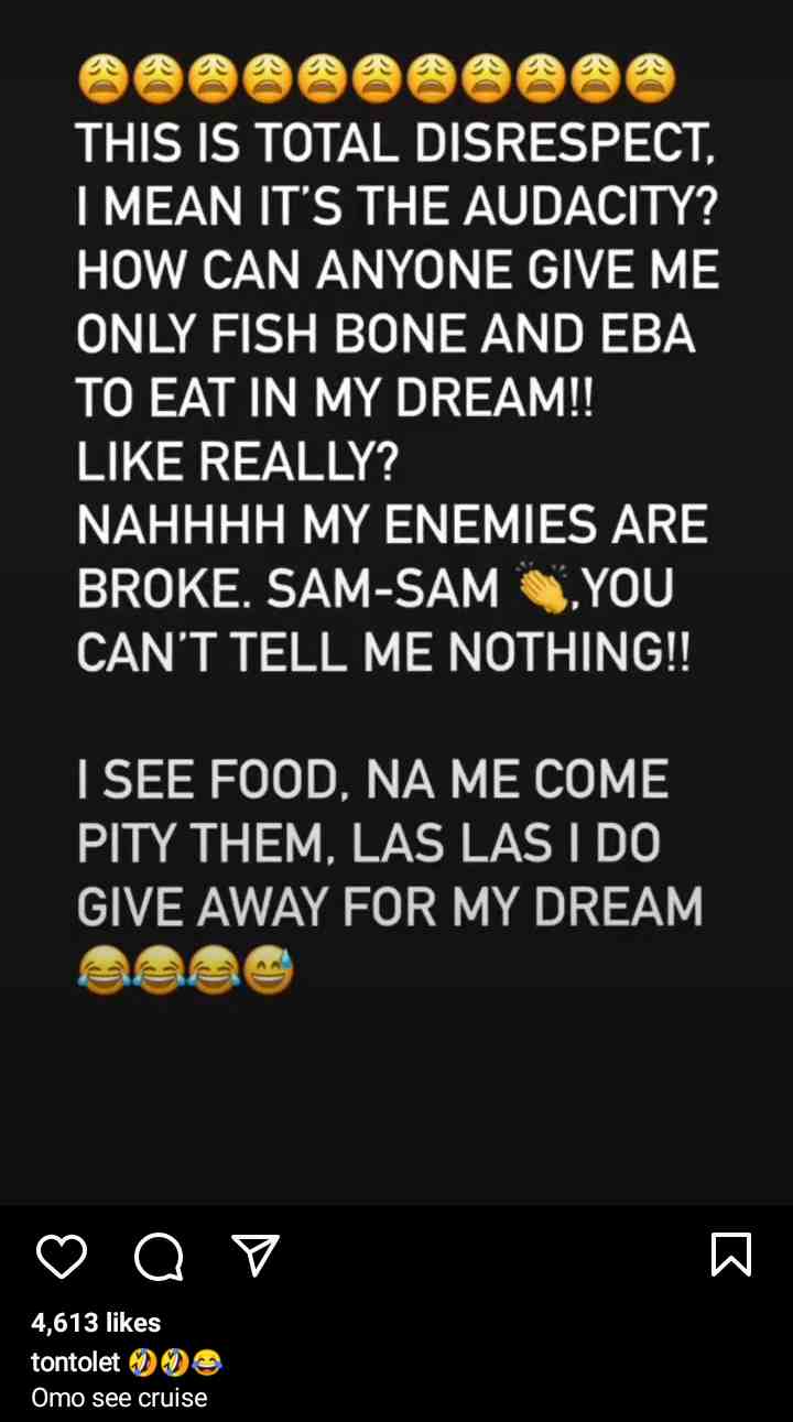 “This is total disrespect, I mean it’s the audacity? How can anyone give me only fish bone and Eba to eat in my dream!! Like really? Nahhhh my enemies are broke. Sam-Sam, you can’t tell me nothing!!