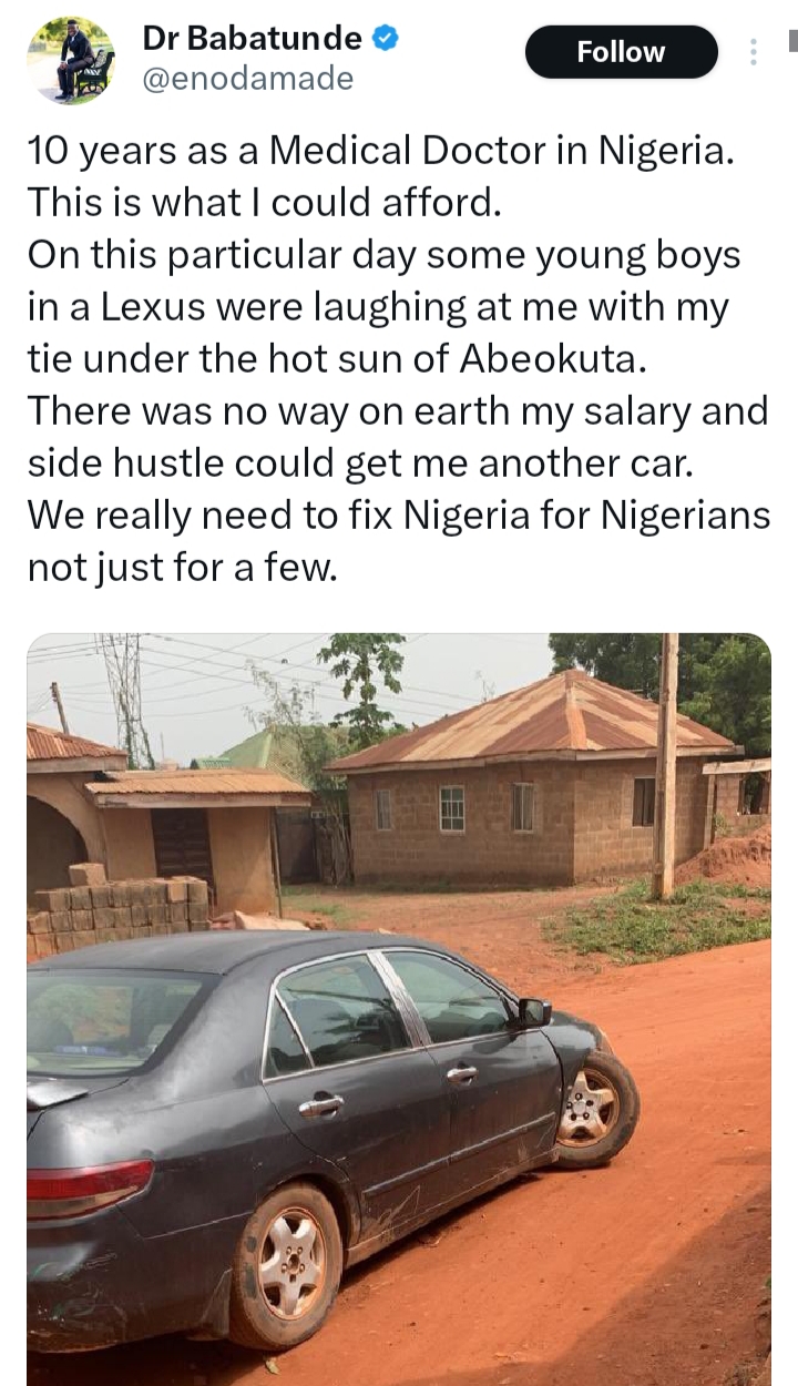 A Nigerian medical practitioner identified on X as Dr Babatunde has stirred conversations online after speaking about his financial struggles despite spending over a decade in the profession.