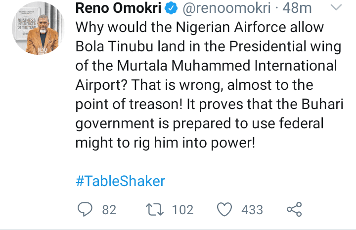“This is wrong!!” – Reno Omokri kicks; slams the military for allowing Tinubu land in the presidential wing of the MMI Airport on Sunday