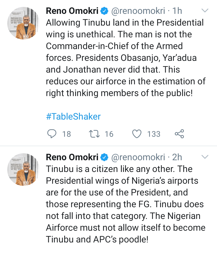“Tinubu is a citizen like any other. The Presidential wings of Nigeria’s airports are for the use of the President, and those representing the FG. Tinubu does not fall into that category. The Nigerian Airforce must not allow itself to become Tinubu and APC’s poodle!” Reno Omokri fumed.