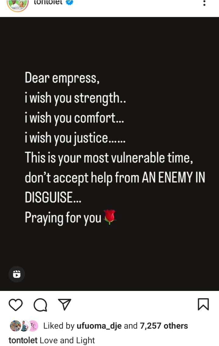 “This is your most vulnerable time, don’t accept help from an enemy in disguise ” – Tonto Dikeh cautions as she offers encouraging words to Empress Njamah
