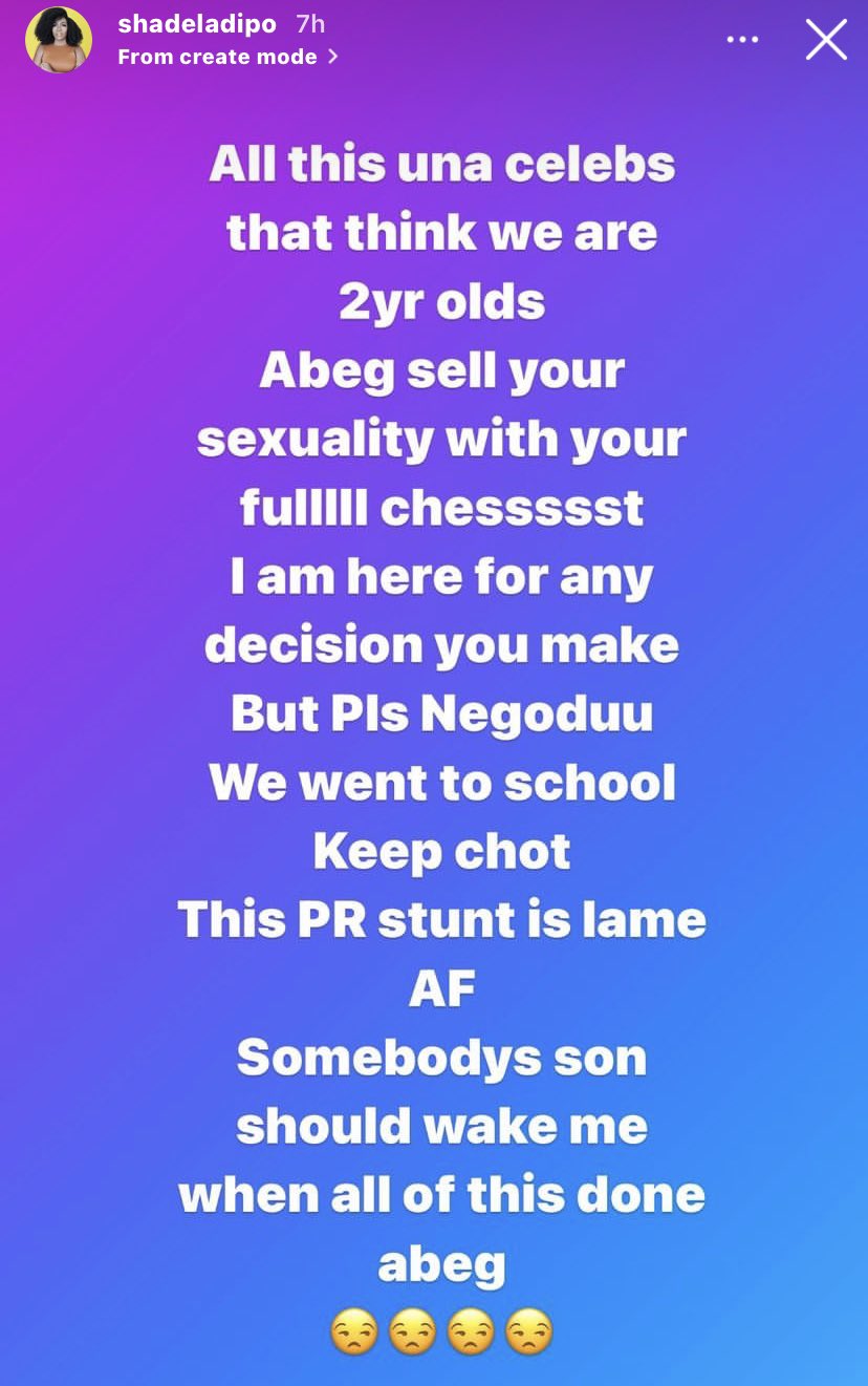 “All this una celebs that think we are 2yr olds, Abeg sell your sexuality with your fulllll chessssst I am here for any decision you make But Pls Negoduu We went to school Keep chot This PR stunt is lame AF